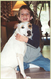 Our sweet Blanca was one of our favorites. She loves people and will smother them with kisses. Blanca now lives with a wonderful family who loves her with all their hearts. She actually gets to sleep in bed with the little boy in this picture!