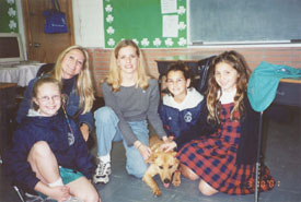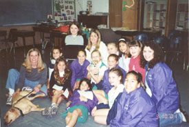 | CC volunteers Cindy Ross and Jeanine Nugent and CC dog Murphy with the Girl Scout troop! |