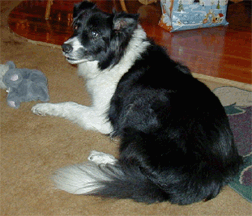 Otis is a border collie who has lived untouched and unacknowledged for six years, left alone twelve hours every day and locked in a utility closet at night. He's been living with a foster Mom for the past month. When he runs like the wind on three legs and catches a ball, a toy, and your love, people think he's five or six. Otis spent his 11th birthday on December 25, 2001 in the San Bernardino Mountains with seven humans, three dogs and one cat.