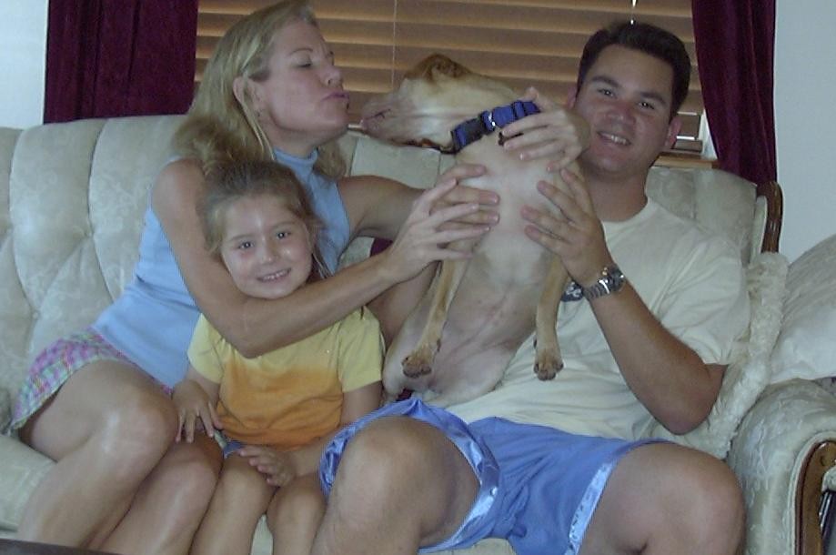 Sally's new family -- Danielle, Jared, and Alana -- is showing Sally the time of her life! Sally is having fun playing fetch, going on walks, and learning to sit. Sally loves playing with her family, including her new feline sibling! As you can see from the photo, Sally gets lots of love! We at Canine Crusaders are very happy for all of them!